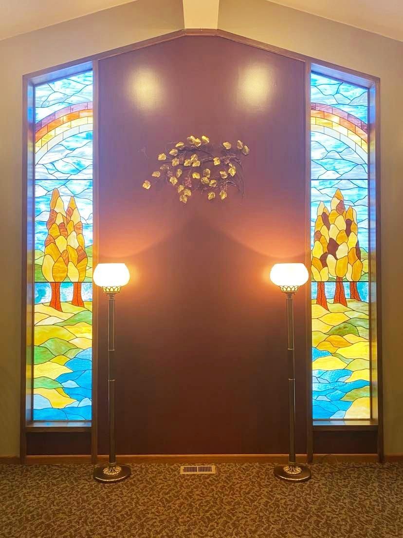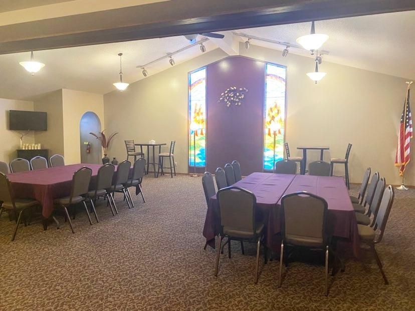 Our spacious upper level features a chapel that is able to comfortably seat 120 guests, as well as a luncheon area designed for a reception following services. This luncheon area can also be used as an overflow area, seating up to an additional 100 guests while services are broadcast via television into the overflow area. The luncheon area is also suitable for use as a serving area for meals, and features a large refrigerator and meal preparation space.